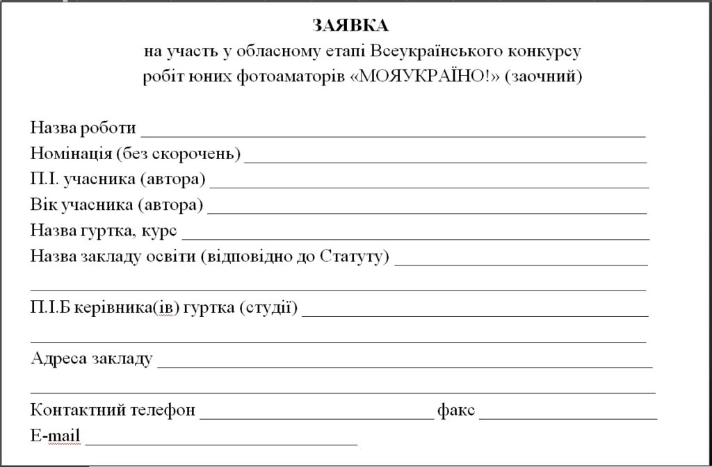 Кожен заклад освіти подає по одній конкурсній фотороботі з кожної із вищезазначених номінацій у електронному варіанті на електронну адресу estet-centr@ukr.net з поміткою фотоконкурс «МОЯ УКРАЇНО!».